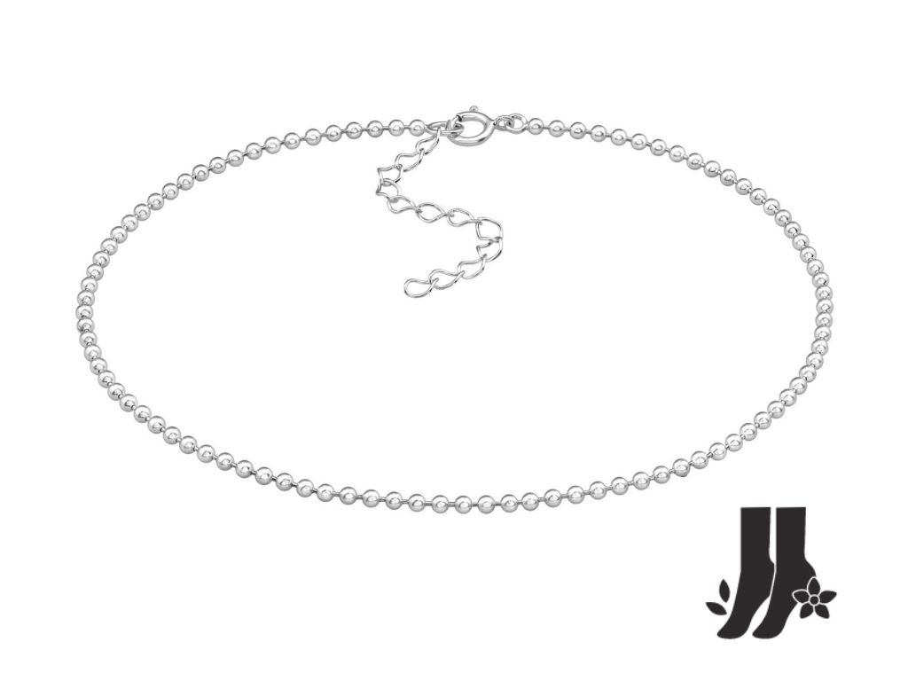 Stříbrný náramek na nohu v minimalistickém stylu nechá krásně vyniknout vašemu kotníku. Skvěle doplní mnoho stylů oblečení. Náramek tvoří řada stříbrných kuliček posázených na řetízku. Velikost náramku perfektně přizpůsobíte vašemu kotníku - délku nastavíte v rozmezí od 22 cm do 26 cm.