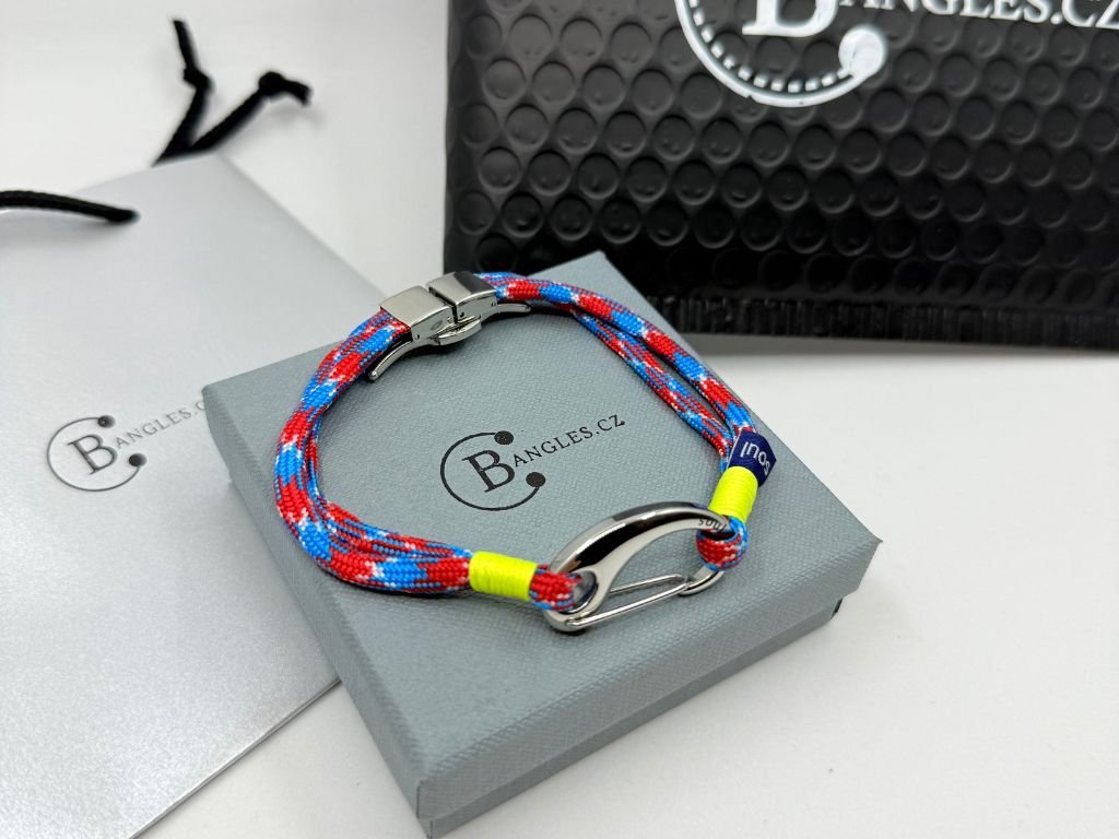 Stylový pánský náramek, který kombinuje kvalitní nerezovou ocel s barevným provazem ve sportovním designu. Dominantním prvkem je originální uzávěr ve tvaru karabiny, jenž dodává náramku moderní a sportovní charakter. Barevný vzor (modrá, červená, žlutá) vytváří dynamický vzhled, který se hodí pro každodenní nošení i volnočasové aktivity. Zapínání je pevné a bezpečné, zajišťující pohodlné nošení.