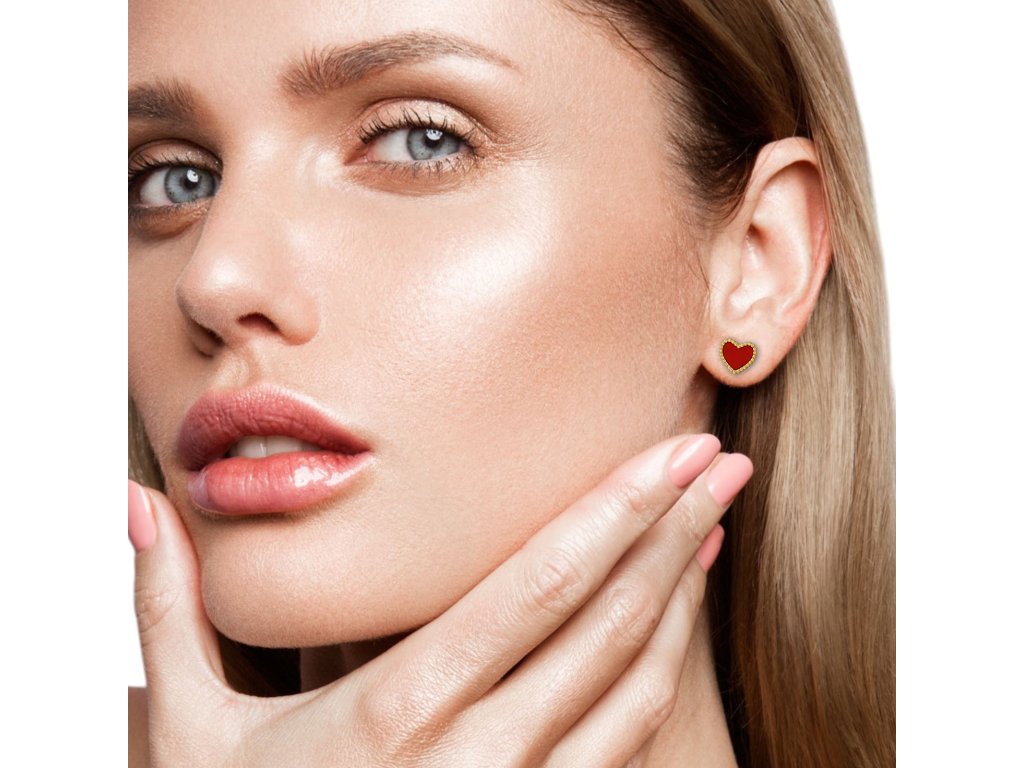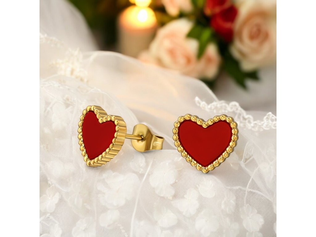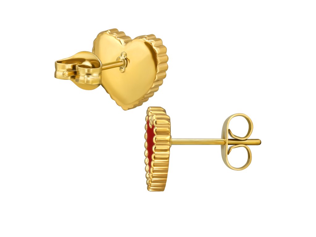 Minimalistické náušnice z chirurgické oceli ve zlatém PVD provedení a červeným epoxidem ve tvaru srdce působí jemně a přitom výrazně.