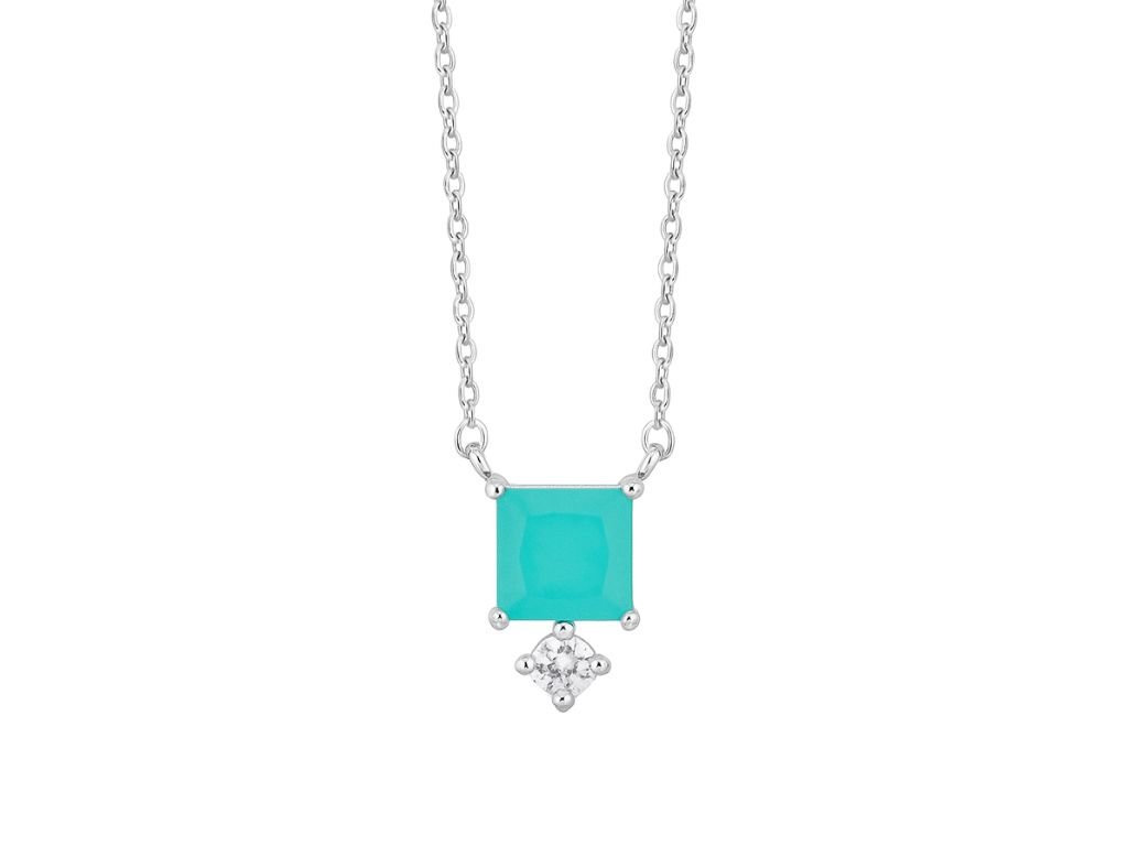 Elegantní náhrdelník z kvalitního stříbra 925, šperk je zdobený výrazným čtvercovým polodrahokamem v jemném tyrkysovém odstínu, doplněným zářivým zirkonem. Ideální jako elegantní doplněk nebo dárek