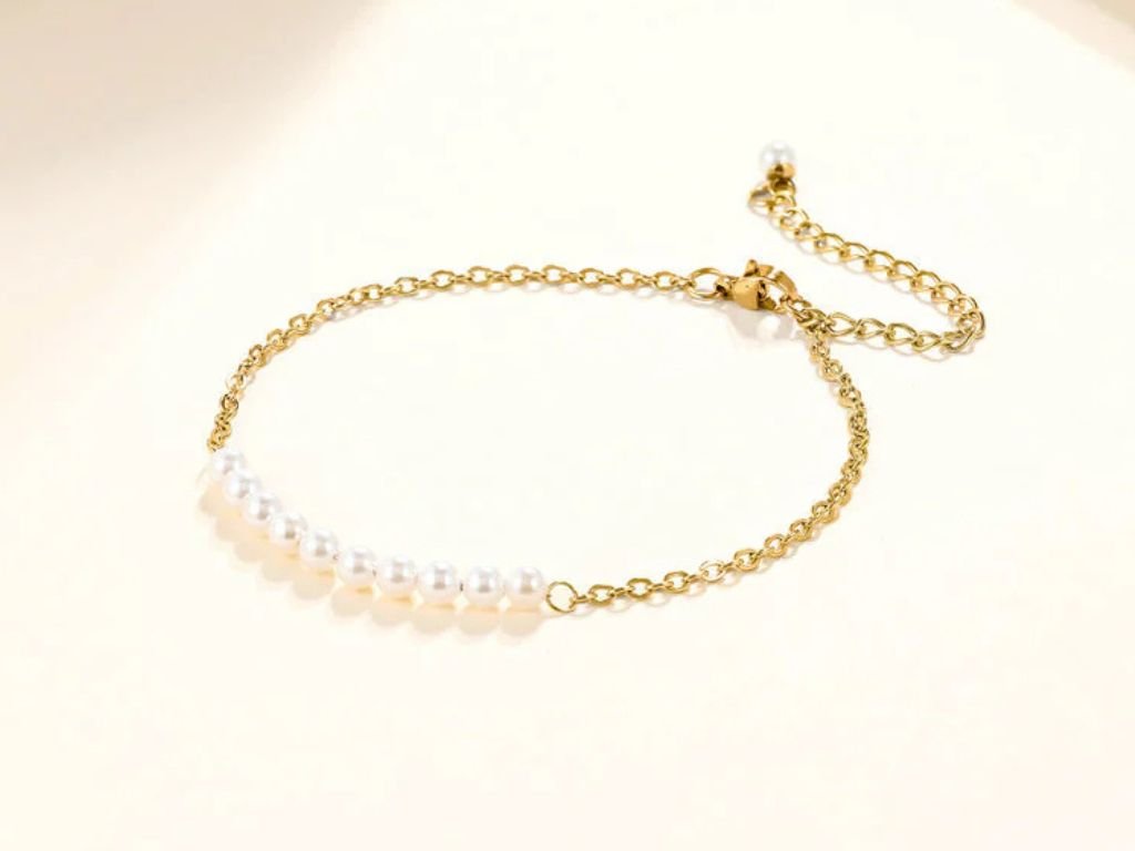 Luxusní náramek s bílými Shell perlami. Spojení lesklých bílých perel s pozlacenou oceli 14K zlatem vytváří dokonalou rovnováhu mezi elegancí a moderním stylem.
