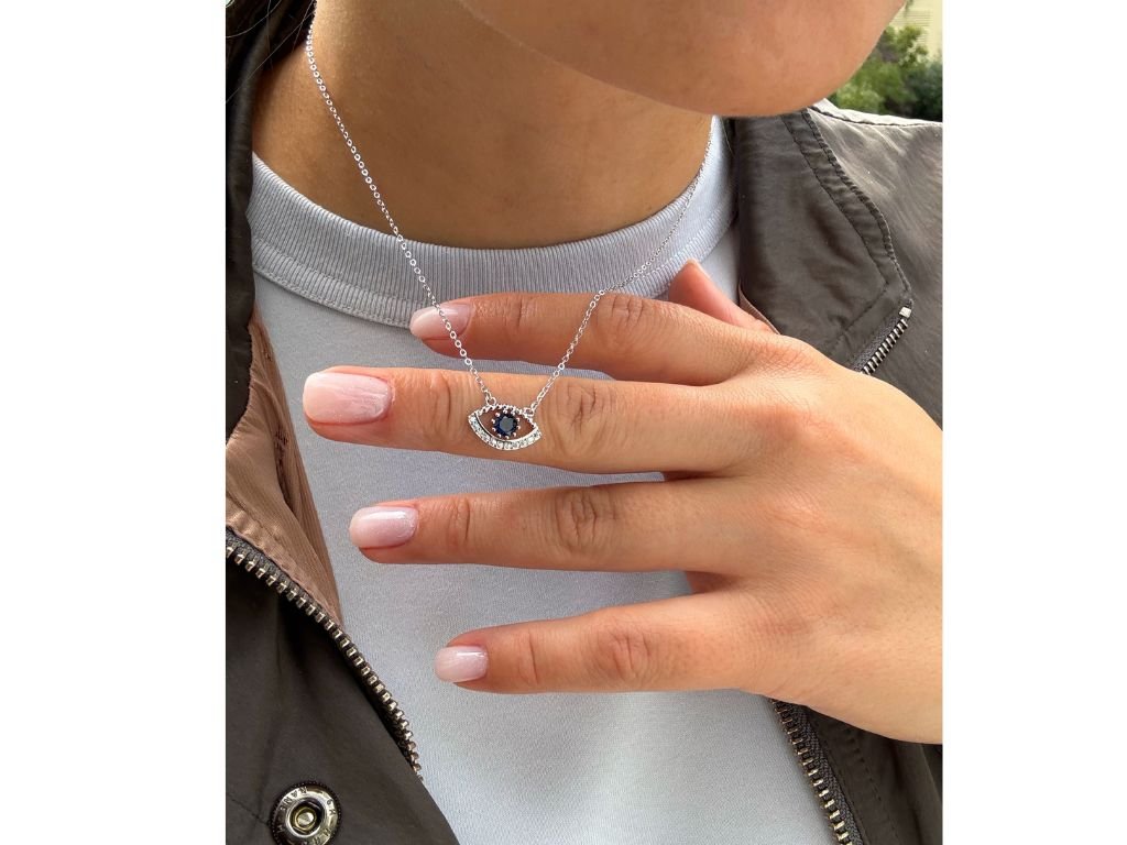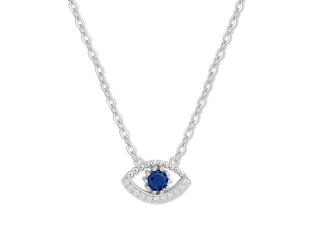 Elegantní stříbrný náhrdelník s přívěskem ve tvaru oka je ozdoben modrým zirkonem a jemnými čirými kamínky.