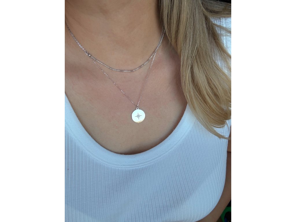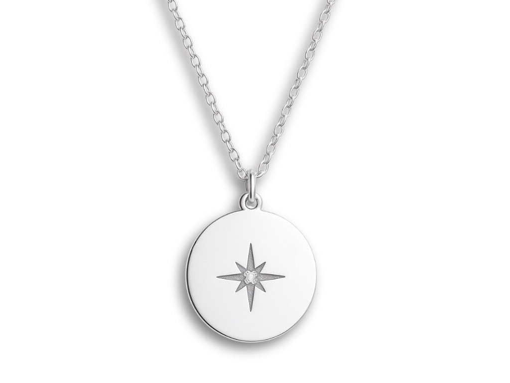 Elegantní stříbrný náhrdelník z rhodiovaného stříbra 925/1000 s kulatým medailonem o průměru 18 mm. Na přední straně je precizně vygravírovaná osmicípá hvězda, jejímž středem prochází třpytivý čirý zirkon. Rhodiovaná povrchová úprava zajišťuje vysoký lesk, odolnost proti oxidaci a dlouhodobou barevnou stálost. Řetízek má délku 42 cm s možností prodloužení o dalších 4,5 cm, takže se přizpůsobí každému dekoltu.