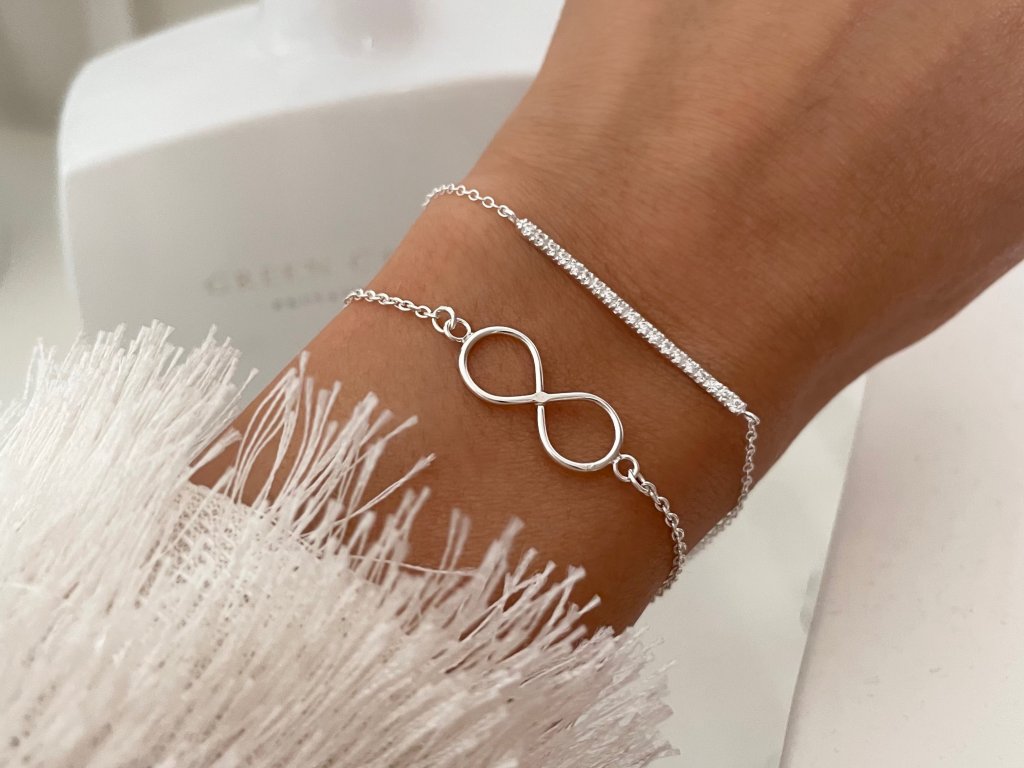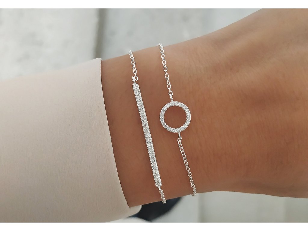Přímka je vyzdobená vsazenými čirými zirkony, díky kterým se náramek na ruce nádherně třpytí.