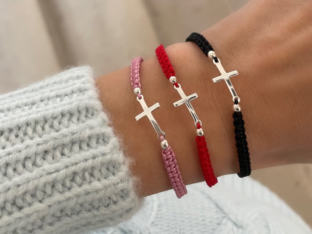 Červený šňůrkový náramek se stříbrným symbolem křížku.
